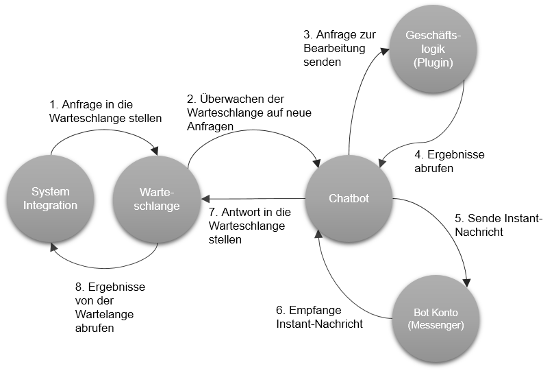 Die System-Integration verwaltet alle Geschäftssysteme, die mit der Business Bot Plattform kommunizieren. Damit eine Verbindung hergestellt werden kann, muss ein Systemintegrationsmodul eingerichtet werden. Das System-Integration Modul beschreibt das zu verbindene Geschäftssystem und die Wartelange auf die entsprechenden Nachrichten abgelegt werden. Mithilfe der eindeutigen Systemkennung und den API Zugangsdaten kann sich das Geschäftssystem verbinden. Folgende Abbildung verdeutlicht den Workflow: