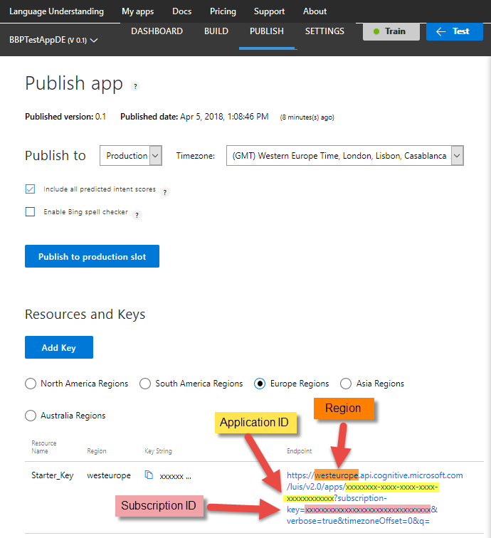 Die Parameter finden Sie auf der Microsoft LUIS-Webseite unter Publish app wie im folgenden Screenshot: