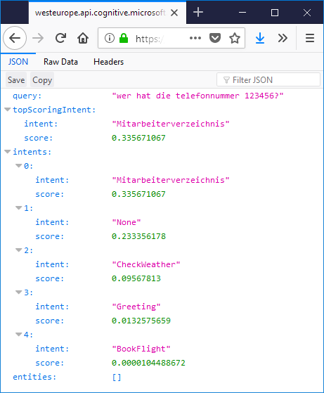 Zum Testen können Sie auch LUIS direkt im Browser über folgende URL-Adresse abfragen: https://westeurope.api.cognitive.microsoft.com/luis/v2.0/apps/###APP_ID###?subscription-key=###SUBSCRIPTION_KEY###&verbose=true&timezoneOffset=0&q=wer%20hat%20die%20telefonnummer%20123456?