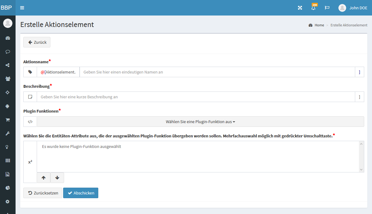 Zum Erstellen eines Aktionselements ruft man über die Navigationsleiste folgendes Formular auf: